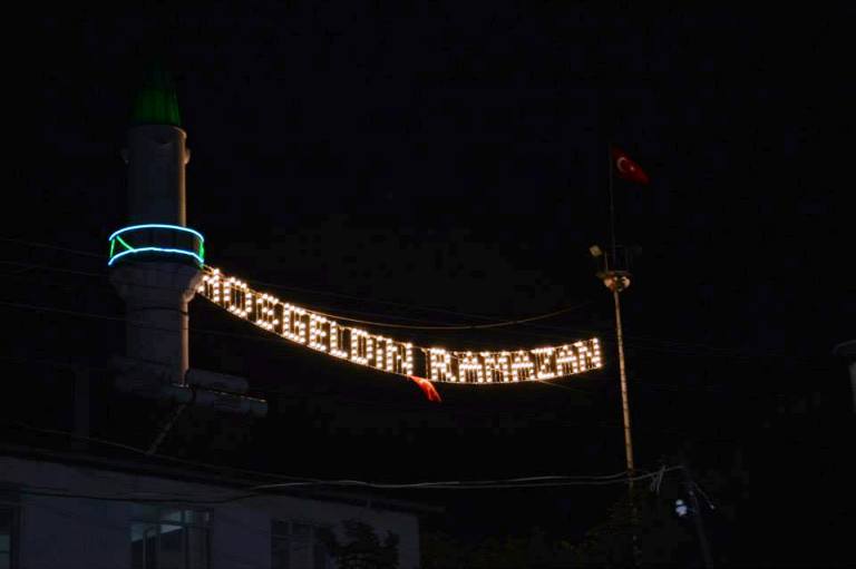 Çelik Halatlar İle Bağlı Olan, 185 Adet Lamba’nın Kullanıldığı, 20 m. Boyunda, 1 m. Eninde, Trifaze 17 Amper Enerji Çeken ‘‘ HOŞGELDİN RAMAZAN” Mahyası , Beldemizi Aydınlatıyor.
