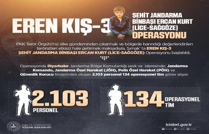 İçişleri Bakanlığı’ndan yapılan açıklamada, “PKK terör örgütünü ülke gündeminden çıkarmak ve bölgede barındığı değerlendirilen teröristleri etkisiz hale getirmek maksadıyla” , Diyarbakır ve Bingöl illerinde “Eren Kış-3 Şehit Jandarma Binbaşı Ercan Kurt operasyonu başlatıldı” denildi. Operasyonda Diyarbakır Jandarma Bölge Komutanlığı sevk ve idaresinde; Jandarma Komando , Jandarma Özel Harekat (JÖH) , Polis Özel Harekat (PÖH) ve Güvenlik Korucu timlerinden oluşan (2.103) personel , (134) operasyonel tim görev alıyor.