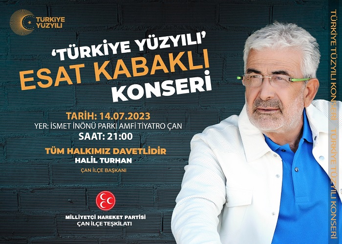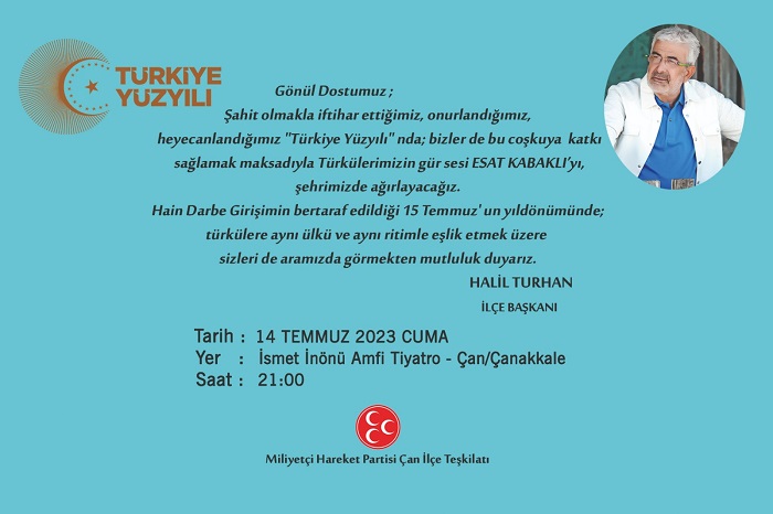 Şahit olmakla iftihar ettiğimiz , onurlandığımız , heyecanlandığımız “Türkiye Yüzyılı“nda , bizler de bu coşkuya katkı sağlamak maksadıyla Türkülerimizin gür sesi ESAT KABAKLI‘yı şehrimizde ağırlayacağız.
