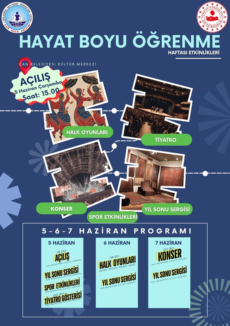 Çan Halk Eğitimi Merkezi, 5-6-7 Haziran tarihlerinde Hayat Boyu Öğrenme Haftası kapsamında çeşitli etkinliklere ev sahipliği yapacak. Toplumun her kesimine hitap eden ve eğitimle buluşturan bu etkinlikler, bölgedeki kültürel ve sosyal hayata önemli bir katkı sunuyor.