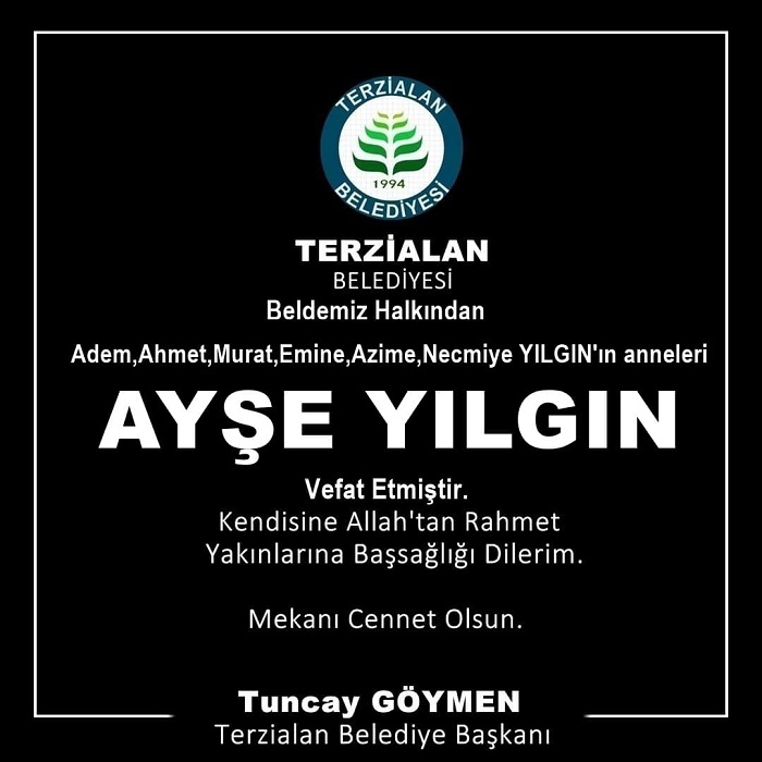 Belde halkından Adem , Ahmet , Murat , Emine , Azime , ve Necmiye‘nin anneleri , Osman ile Cemile kızı , merhum Mustafa eşi AYŞE YILGIN vefat etmiştir.